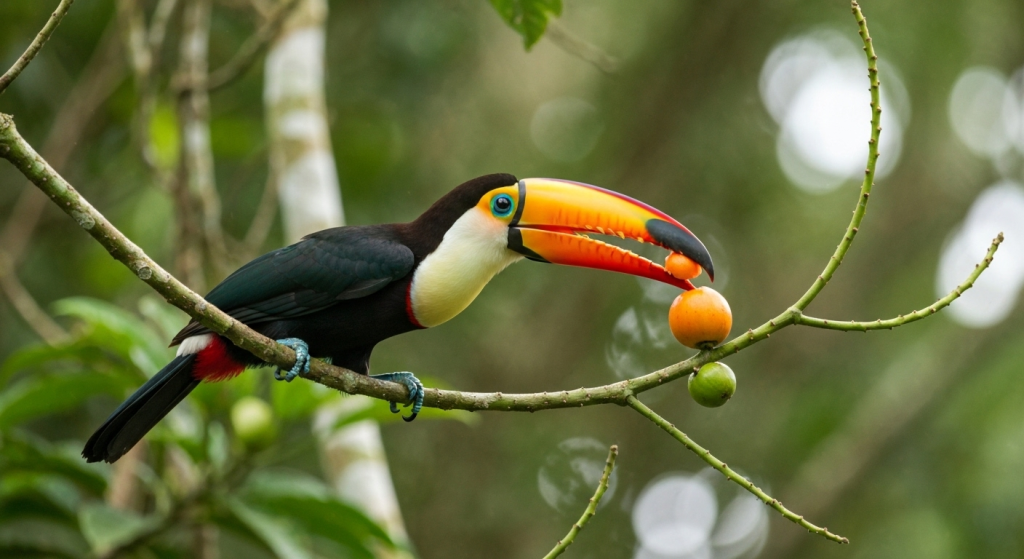 Toucans are primarily frugivores, meaning their diet consists mainly of fruit. Their long, oversized bill is the perfect tool for this job. It gives them an extended reach, allowing them to sit on a sturdy branch and pluck berries and fruits from the tips of thinner, more fragile branches that would never be able to support their body weight. This ability gives them access to food sources that are out of reach for smaller-billed birds.