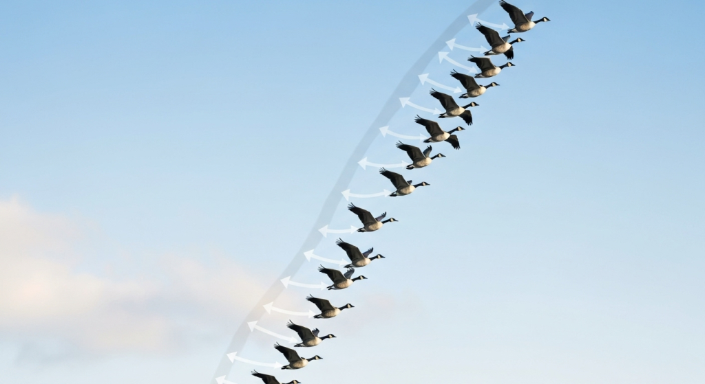 To solve this problem, geese and other formation-flying birds use a strategy of rotating leadership. It’s a beautiful and highly effective example of cooperation. After a period of time, the lead bird will drop back into one of the trailing positions in the V to recover. A different bird from the flock then moves up to take its place at the front.