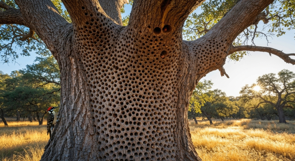 If you’ve ever hiked through the oak woodlands of the American West, you might have stumbled upon a strange and wondrous sight: a tree trunk, often a dead snag or an old telephone pole, peppered with thousands of perfectly drilled holes. Each hole is meticulously plugged with a single acorn, creating a striking mosaic of nature’s ingenuity. This isn’t random art; it’s a masterpiece of survival engineering created by one of the most social and fascinating birds in North America—the Acorn Woodpecker. These structures, known as granary trees, are far more than just a place to store food. They are the center of a complex society, a treasure to be defended, and a legacy passed down through generations.