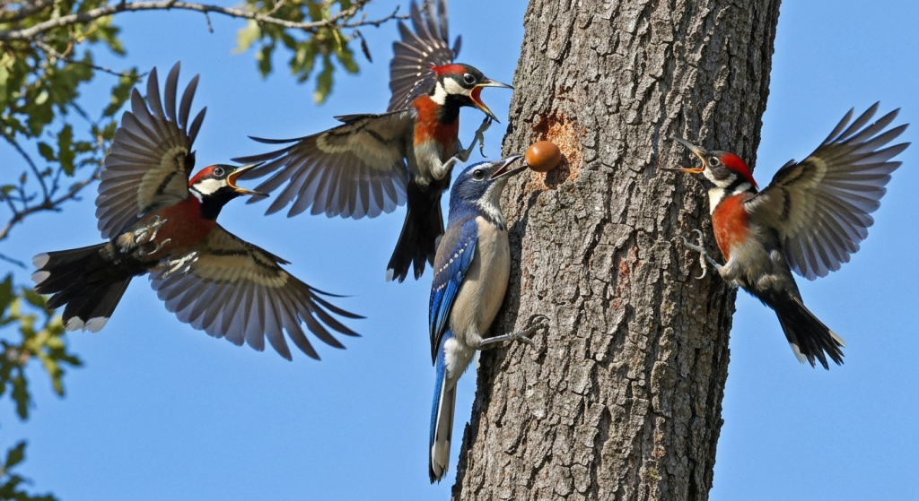 Owning a massive, visible stockpile of food in the middle of the woods means you’re always a target. Acorn Woodpeckers face a constant barrage of would-be thieves, and defending their granary is a top priority. Their primary competitors are Acorn Jays, squirrels, and even other woodpeckers who would rather steal than do the hard work of collecting their own acorns.