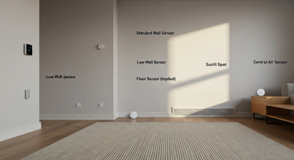 • Use Remote Sensors: If your smart thermostat (like an ecobee or Nest) has remote “puck” sensors, don’t put them on a dresser. Place one on a small stand, low to the ground, in the middle of the room (but out of foot traffic). Tell the thermostat to use that sensor as the primary one for the zone.