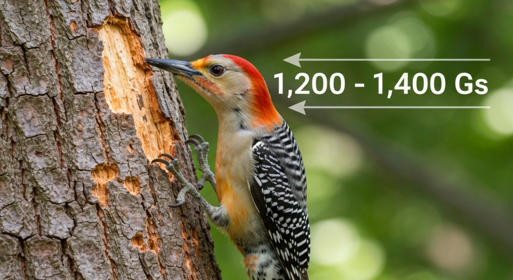 To truly appreciate a woodpecker’s protective gear, we first need to understand the incredible forces it endures. Scientists measure impact force in G-force, where 1 G is the force of gravity we experience every day. The numbers associated with woodpecker drilling are staggering.