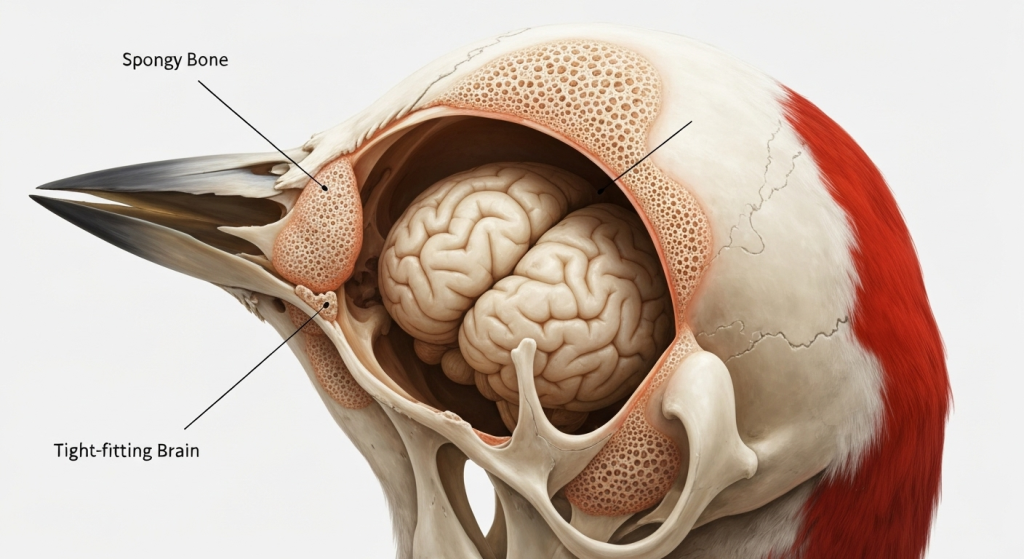 The woodpecker’s brain, however, has almost no room to move. It’s packed in so snugly that the damaging sloshing motion is prevented. Furthermore, the brain is oriented in a way that maximizes the surface area in contact with the skull, which helps to spread out any impact force that does get through. This combination of a tight fit and broad contact area is a simple but highly effective way to keep the delicate brain tissue stable and secure during drilling.