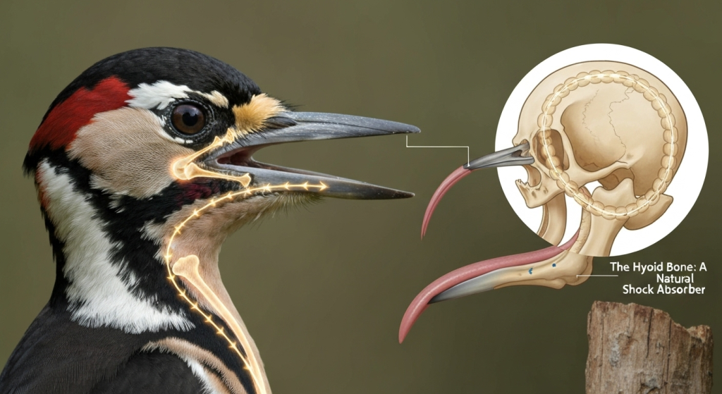 Perhaps the most remarkable adaptation in a woodpecker’s head is the hyoid apparatus. In most vertebrates, including humans, the hyoid is a small bone in the throat that supports the tongue. In the woodpecker, it is an extraordinarily long and flexible structure made of bone and cartilage that has evolved into a sophisticated safety system.